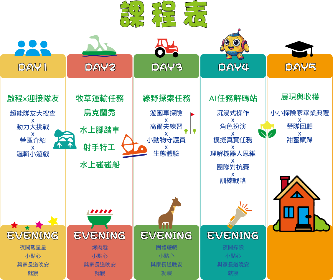 5-5.隊輔老師將於營隊開始前 1 週內來電自我介紹,並留下聯絡方式給家長,再次叮嚀!請勿攜帶貴重物品,因團體生活保管不易,若有遺失,恕不負責!