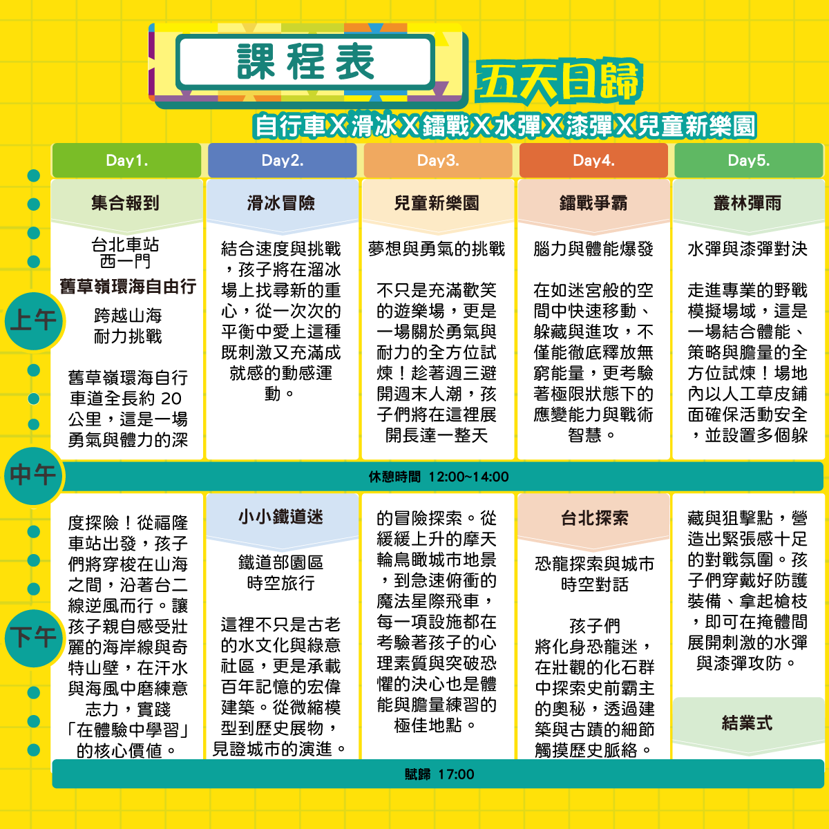 想讓孩子在五天內體驗各種極限挑戰,培養獨立思考與團隊合作能力嗎?結合戶外運動、城市探索與生態體驗,讓孩子親身感受速度、力量與策略的樂趣,突破自我,成為真正的探索高手!