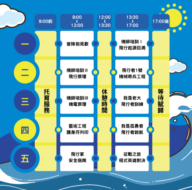 營隊時間: 每天 09:00 ~ 17:00(最早08:30到校,最晚17:30離開)